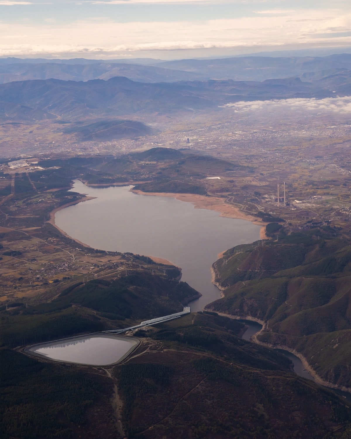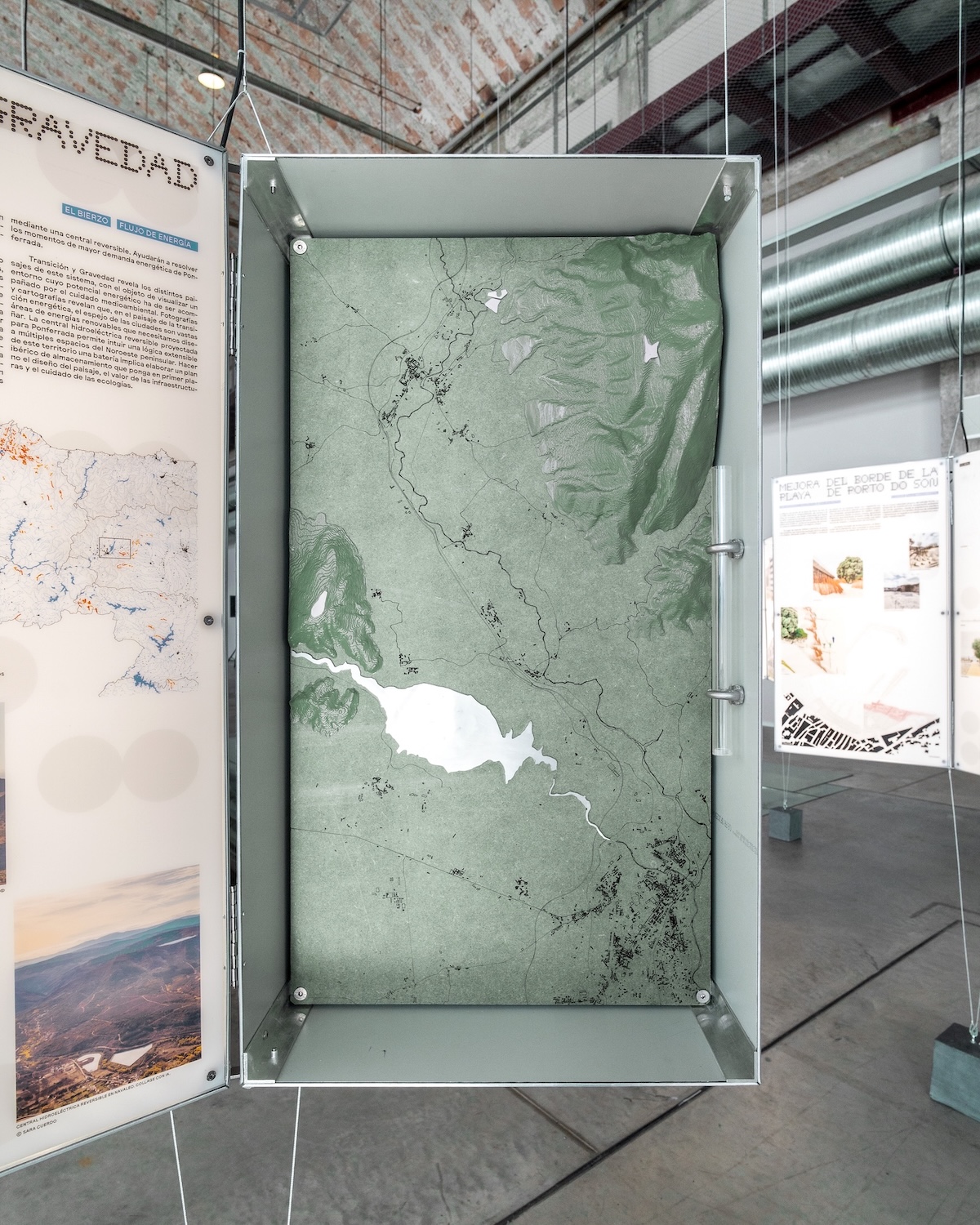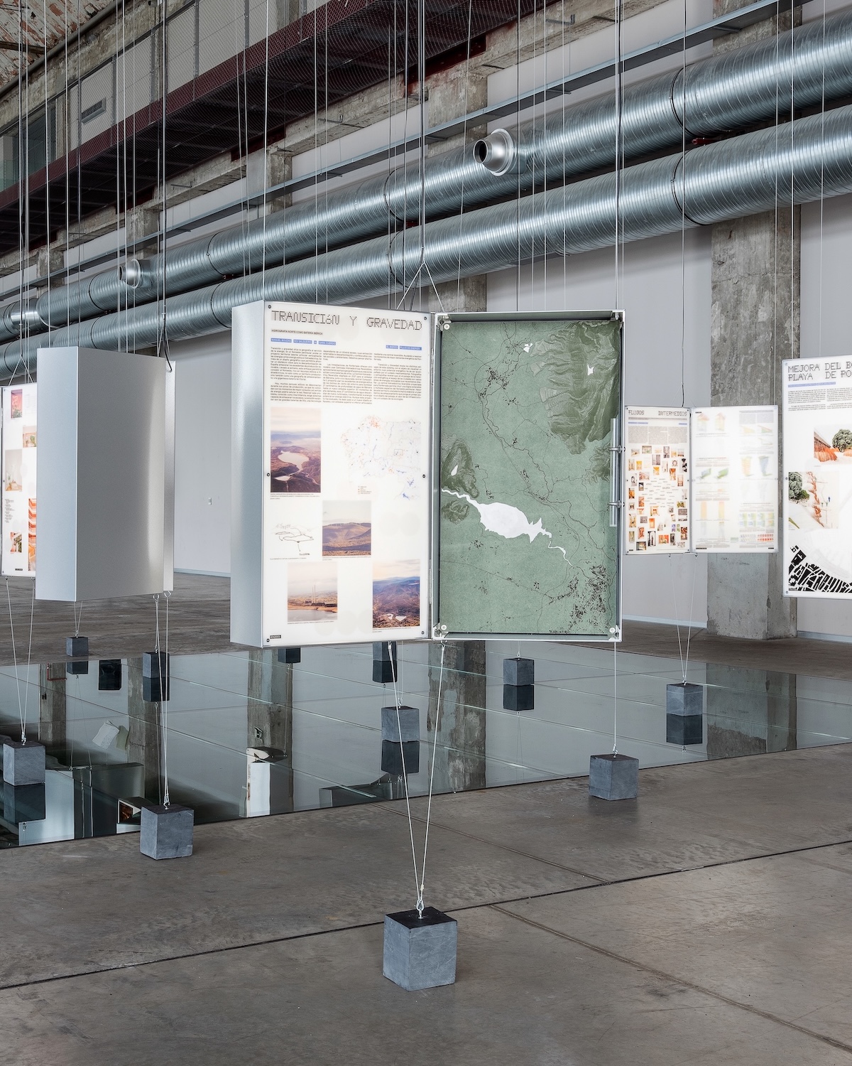 Transition and Gravity is our contribution to Flujos Comunes at the 2025 Spanish Architecture and Urbanism Biennial, curated by Ander Bados and Miguel Ramón. The exhibition explores how architects and planners engage with transnational flows of commodities, energy, people, and data. It takes place in Ponferrada, a territory historically shaped by coal extraction and energy infrastructures, such as the Compostilla power plants—where the exhibition is held. The research examines the energy transition in a region that once powered Spain, focusing on pumped-storage hydropower as a non-extractive alternative for large-scale renewable energy storage. Based on two regional projects under development at the Bárcena reservoir and Navaleo, the research addresses a key challenge of decarbonization: the intermittency of renewable energy. By using surplus wind power to pump water into elevated reservoirs and releasing it during peak demand, energy is stored through geography itself. This approach offers an alternative to lithium-based batteries, avoiding the social and environmental costs of mineral extraction. Through images, cartographies, and models, the project visualizes how the echo of urban expansion is embedded in these vast operationalized technical landscapes. The pumped-storage plant planned for Ponferrada proposes a logic extendable across the northwestern Iberian Peninsula, pointing toward a broader storage system centered on landscape, infrastructural, and ecological design.