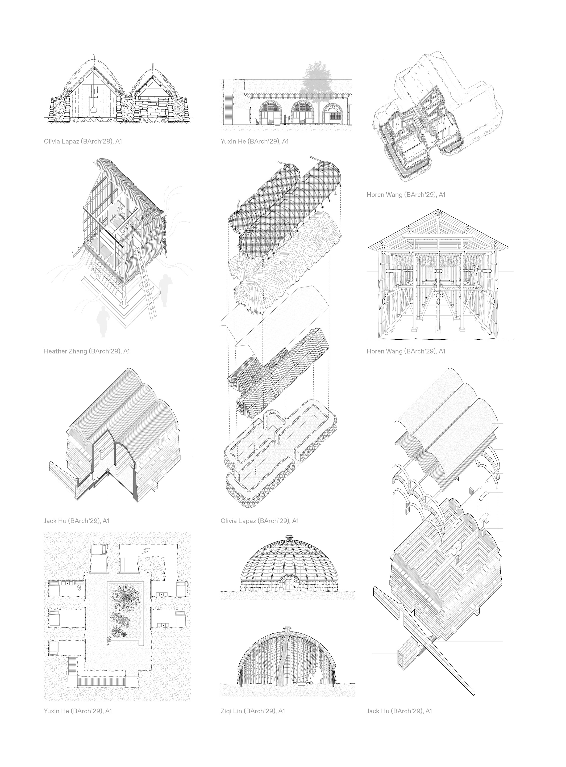 Assignment 1 trains students to document and analyze precedents, reinterpret their essential ideas, and convert those insights into new spatial and material concepts. Students record organizational and construction logics, extract and abstract design principles, and apply them in a short design competition.