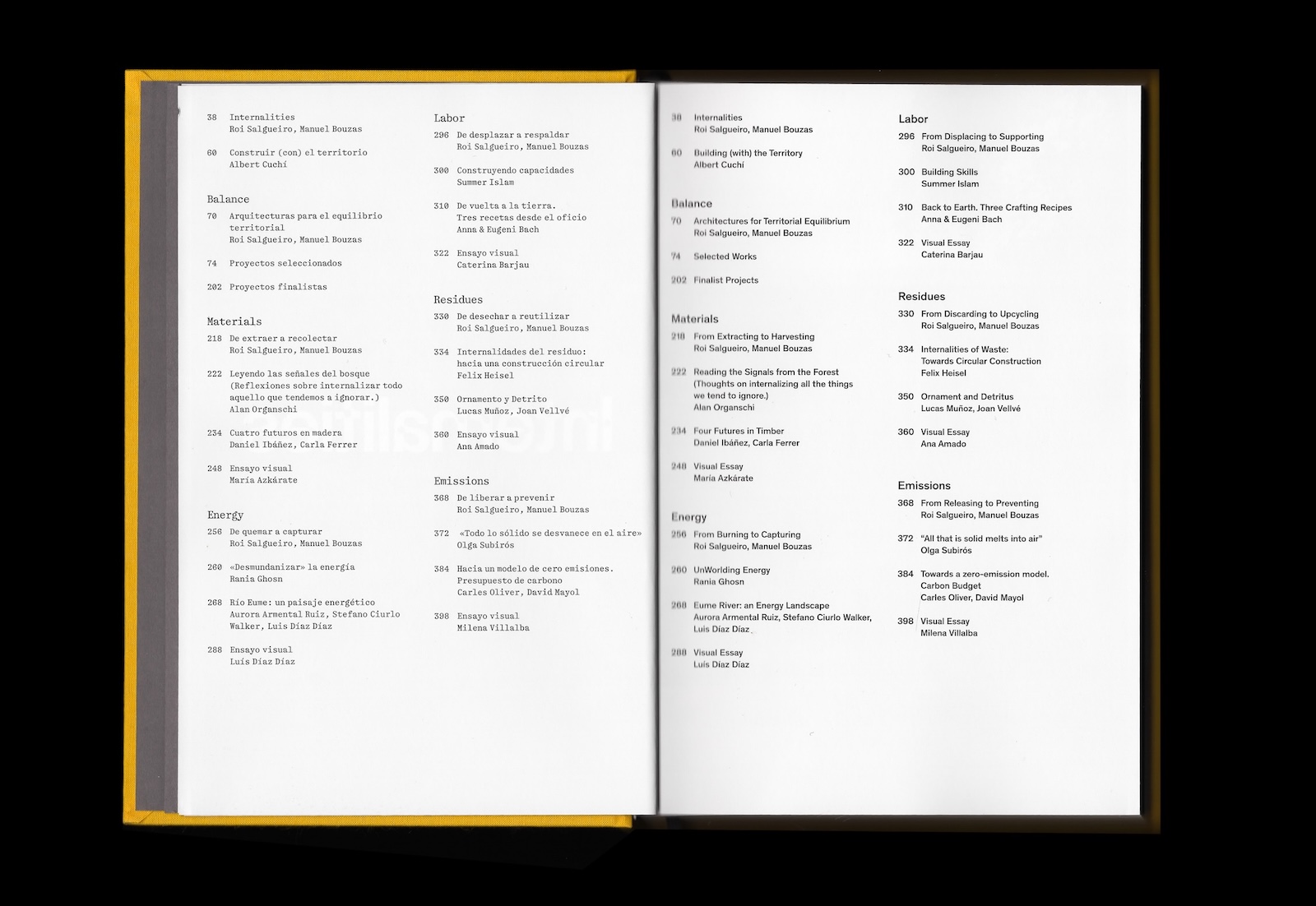 Internalities is the project selected to represent the Spanish Pavilion at the 19th Venice Architecture Biennale 2025. Curated by Roi Salgueiro and Manuel Bouzas, it examines how architects can—and must—minimize the environmental externalities of production processes. The accompanying book and newspaper (catalogue), published by Arquia Foundation and edited by the curators, features contributions from exhibition participants and includes more than a dozen original critical essays by international scholars—including Iñaqui Carnicero, Albert Cuchí, Alan Organschi, Rania Ghosn, Summer Islam, Felix Heisel, and Olga Subirós—complementing texts by the curators and by the researchers responsible for each of the five Internalities axes: Materials (Daniel Ibáñez and Carla Ferrer), Energy (Aurora Armental and Stefano Ciurlo), Labor (Anna & Eugeni Bach), Residues (Lucas Muñoz and Joan Vellvé), and Emissions (Carles Oliver and David Mayol). The book highlights the work of a new generation of Spanish architects whose practices prioritize local, regenerative, and low-carbon-footprint resources, deepening the regional ecologies of materials such as wood, stone, and earth, as well as the forests, quarries, and soils from which they are sourced. Understood as an in-depth design research project, the book aims to foster a conversation on how architecture can strengthen new territorial balances and develop novel agreements between ecologies and economies.