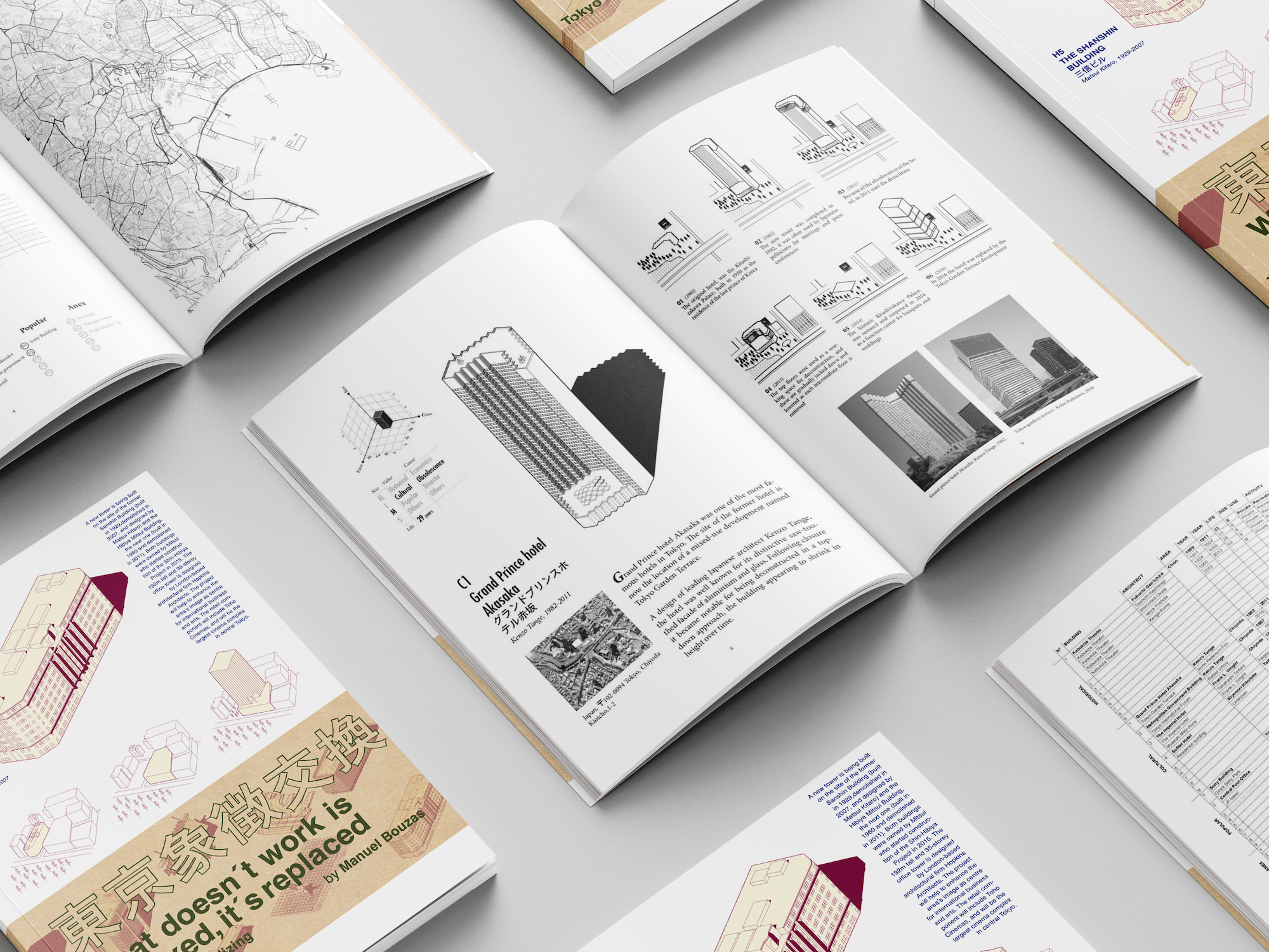 The project is motivated by the observation that in Tokyo, "what doesn’t work is not fixed; it is replaced," resulting in the constant upgrading of older buildings, symbols, and landmarks. The research aims to comprehend and visually represent the continuous flows of material and metabolic exchange within the city. It examines 20 case studies where iconic buildings have undergone various processes of replacement and transformation since the mid-20th century. In Tokyo, residential houses typically have an average lifespan of 26 years. This suggests that a significant portion of the city's buildings erected three decades ago no longer exist in their original shape. Two key factors drive the city's constant replacement. Firstly, Tokyo's urban fabric is composed of millions of isolated structures spaced one meter apart to prevent earthquakes, making it easy to replace. Secondly, buildings in Tokyo do not strive for a homogeneous identity but a radical heterogeneity in terms of size, style, and materiality. This characteristic stands in contrast to Western urban culture, where buildings often contribute to a cohesive and historical image of the city. But even if the image of the city is not exactly the same, Tokyo is still being Tokyo.